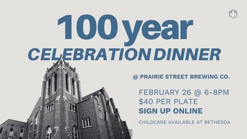 Join us at Prairie Street Brewing Co for a banquet in honor of 100 years of ministry! Childcare will be available at Bethesda for those attending the dinner.